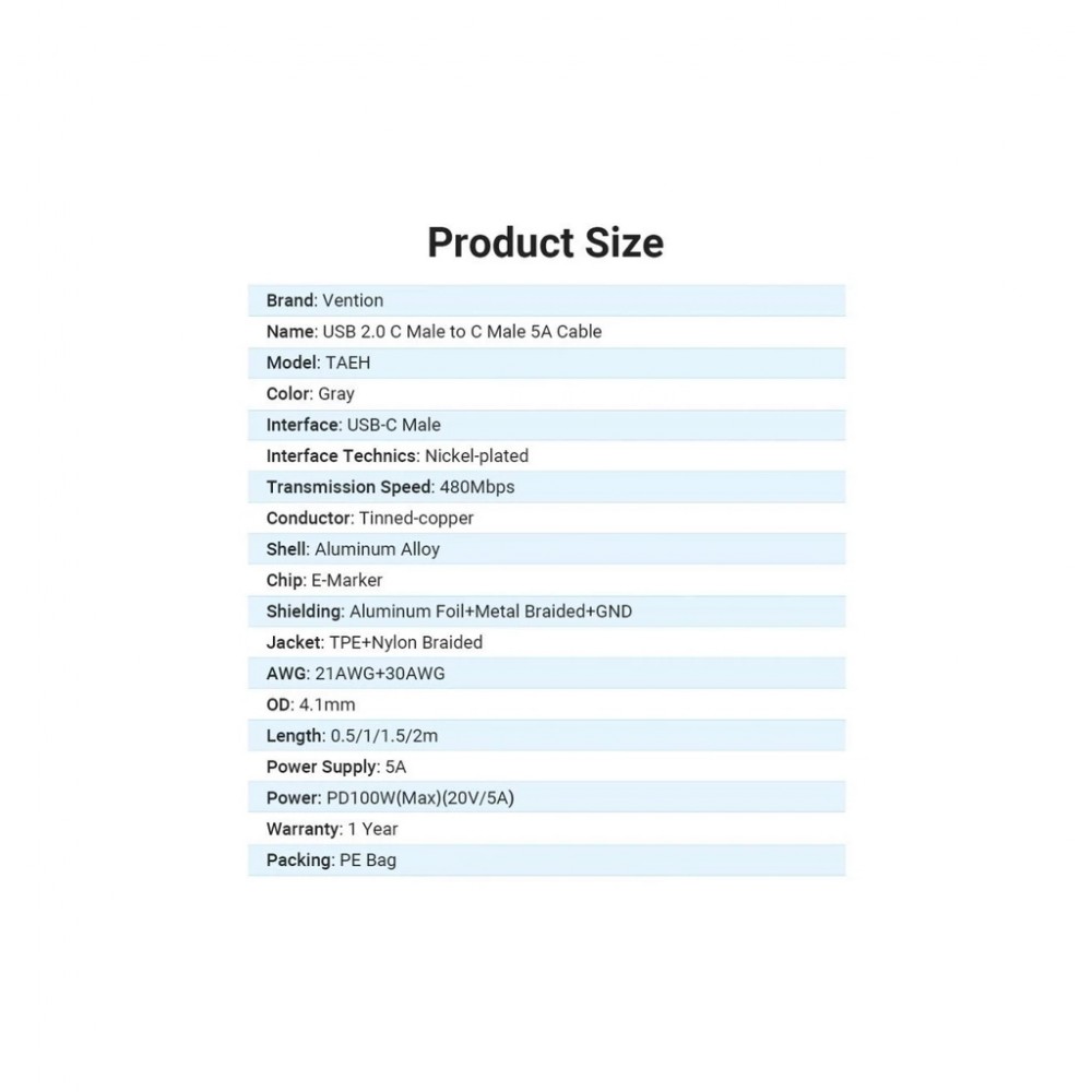 Дата кабель USB-C to USB-C 2.0m 5A aluminum gray Vention (TAEHH)
