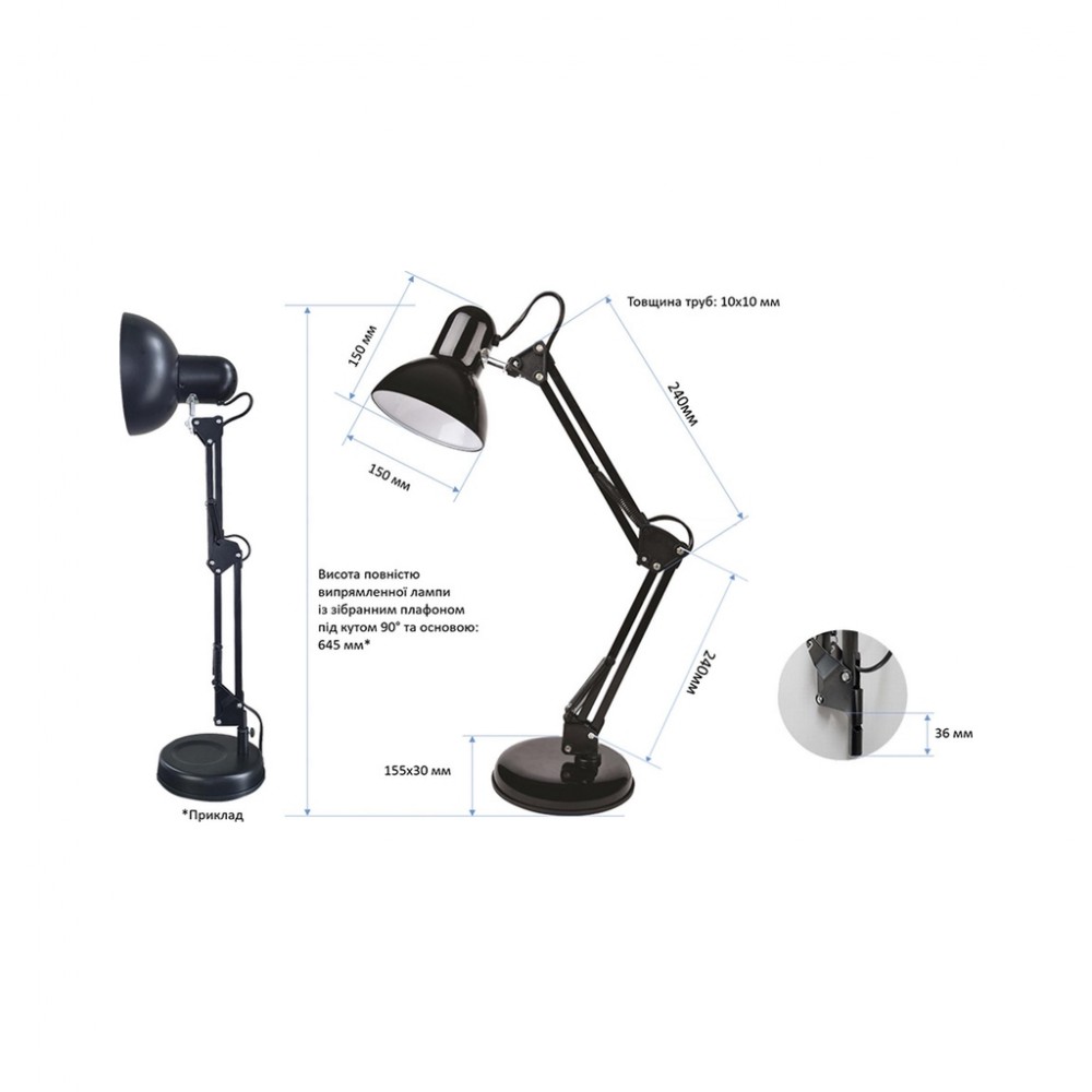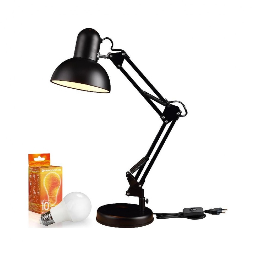 Стиль - модерн, Вид лампи - офісні, Тип лампи - світлодіодна (LED), лампа розжарювання, Кріплення - підставка, вбудована (незамінна), Вимикач - кнопка на дроті, ні, так, Матеріал - метал, пластик, Колір - чорний