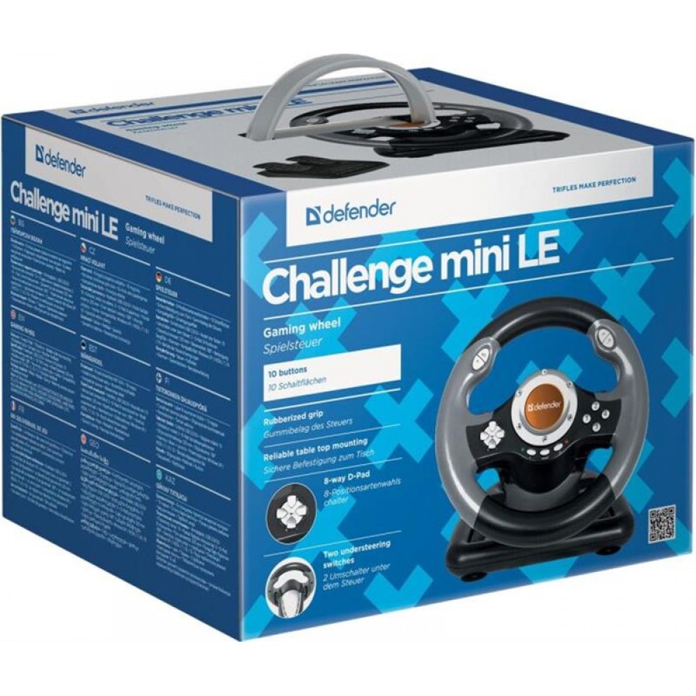 Кермо Defender Challenge Mini LE (64351) має такі особливості: провідний; USB; сумісність: ПК, PS3; діаметр керма: 20 см; матеріал обплетення керма: гума; кут повороту керма: 180 °; D-pad; 10 кнопок; педалі: газ, гальмо; можливість відключення педалей і підключення підрульових перемикачів для прискорення та гальмування. Унікальне кермо допоможе перенестися у світ швидкості та невпинного руху.