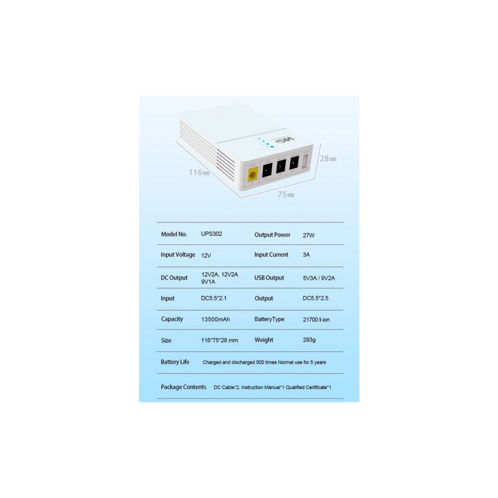 ДБЖ RCI для роутера WGP 27W вх:5.5x2.1, вих:5.5x2.5 12V/2A (UPS302 / 560580)