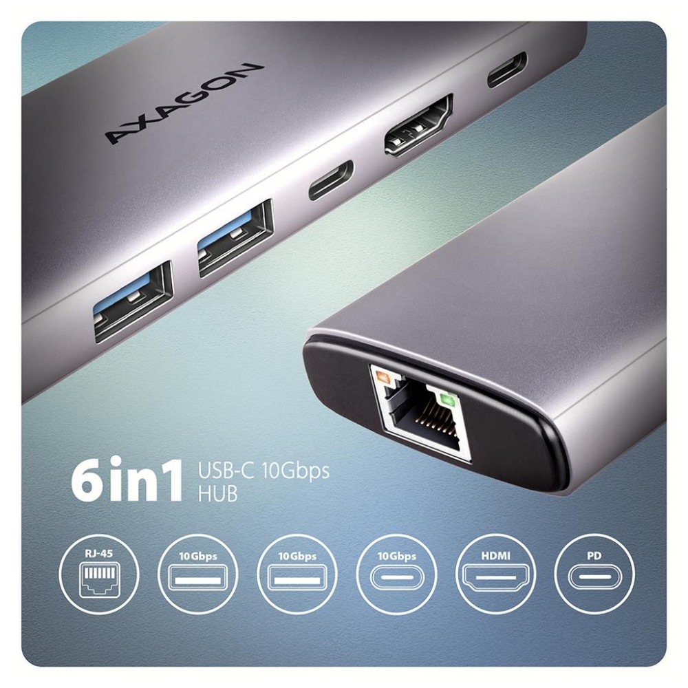 USB-хаб AXAGON USB-C to 2xUSB-A + 1xUSB-C + HDMI + RJ45 + PD100W (HMC-6G2L)