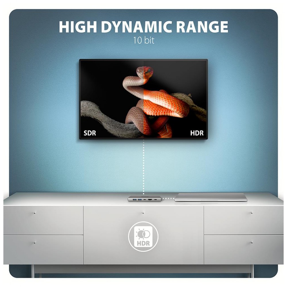 HDMI-вихід забезпечує передачу відео з роздільною здатністю до 4K при 60 Гц, а також підтримує WQHD при 120 Гц і FullHD при 240 Гц. Технологія HDR розширює контрастність і глибину кольору, створюючи реалістичне відтворення зображення. Концентратор підтримує DisplayPort Alternate Mode, тому для виведення відео достатньо підключити пристрій через USB-C або Thunderbolt 3/4.