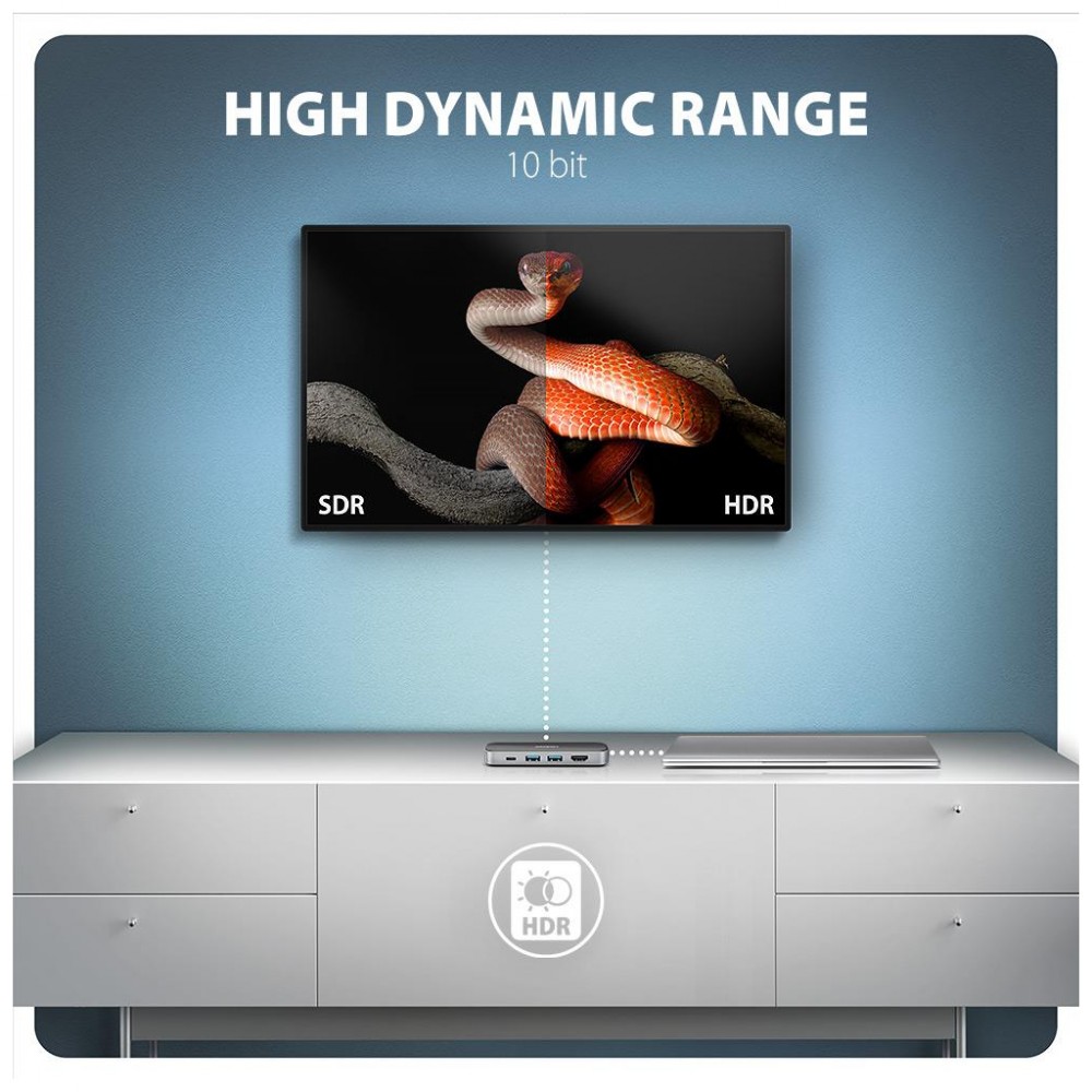 Порт HDMI підтримує відеовихід у форматі до 4K Ultra HD із частотою 60 Гц, а також WQHD при 144 Гц і FullHD при 240 Гц. Завдяки HDR підтримується розширений діапазон яскравості та кольорів, що забезпечує природну передачу зображення. Це рішення підходить як для роботи з графікою, так і для перегляду фільмів чи ігор. Для відеовиходу потрібен USB-C порт із підтримкою DisplayPort Alt Mode або Thunderbolt 3/4.