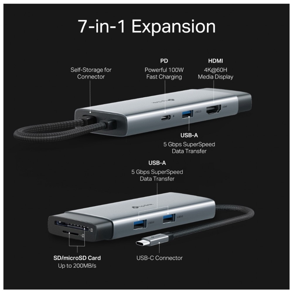USB-хаб TP-Link USB-C 7-in-1 3xUSB + HDMI + SD/TF + USB-C PD100W (UH7021C)