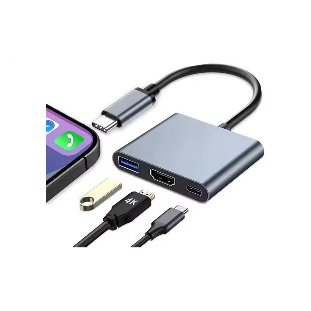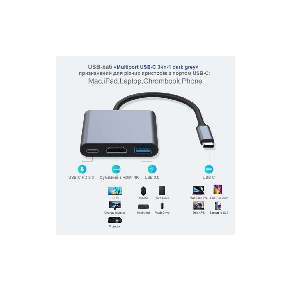 USB-хаб Dynamode USB-C 3-in-1 1xHDMI 4K + 1xUSB 3.0 + 1xUSB-C PD 87 (Multiport USB-C 3-in-1 dark grey)