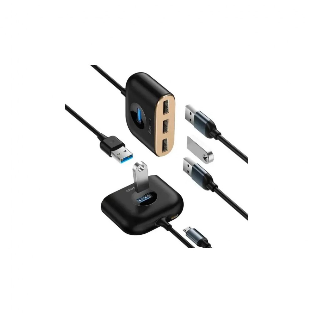 USB Hub Baseus Square Round 4 in 1 — це зручний та функціональний хаб, який підключається до ПК або ноутбука за допомогою інтерфейсу USB 3.0. Модель дозволяє значно розширити функціональність пристрою, додавши до його арсеналу 4 USB-порти, три з яких – USB 2.0, які дозволять під'єднати різні периферійні пристрої, флешки тощо. Один роз'єм USB 3.0 розрахований для підключення зовнішніх накопичувачів та флешок, оскільки забезпечують швидкість передачі даних до 5 Гбіт/с. Три порти USB 2.0 дадуть можливість задіяти додаткові миші, клавіатури, геймпади та інші USB-пристрої, в яких не важлива швидкість передачі даних і ще один маленький бонус, є microUSB.